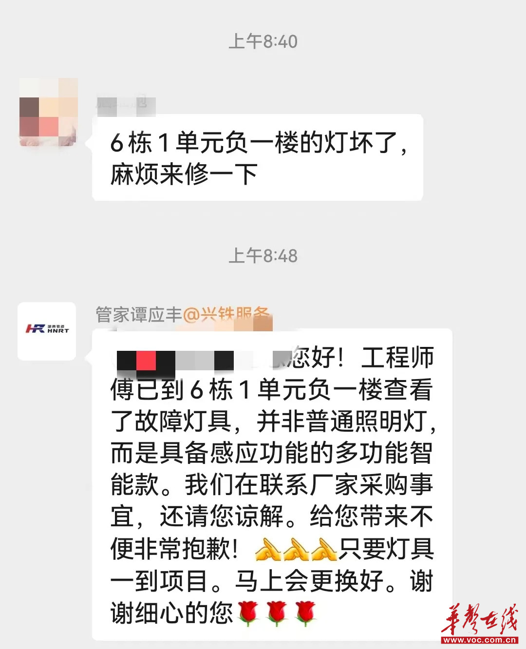 10月的某一天,湘府和園業主群有人反映負一樓照明燈故障。微信聊天記錄顯示,從提出問題開始,工程師就位,查明情況,一直到解釋回復,整個過程僅用8分鐘,響應迅速、態度熱情、簡潔高效。