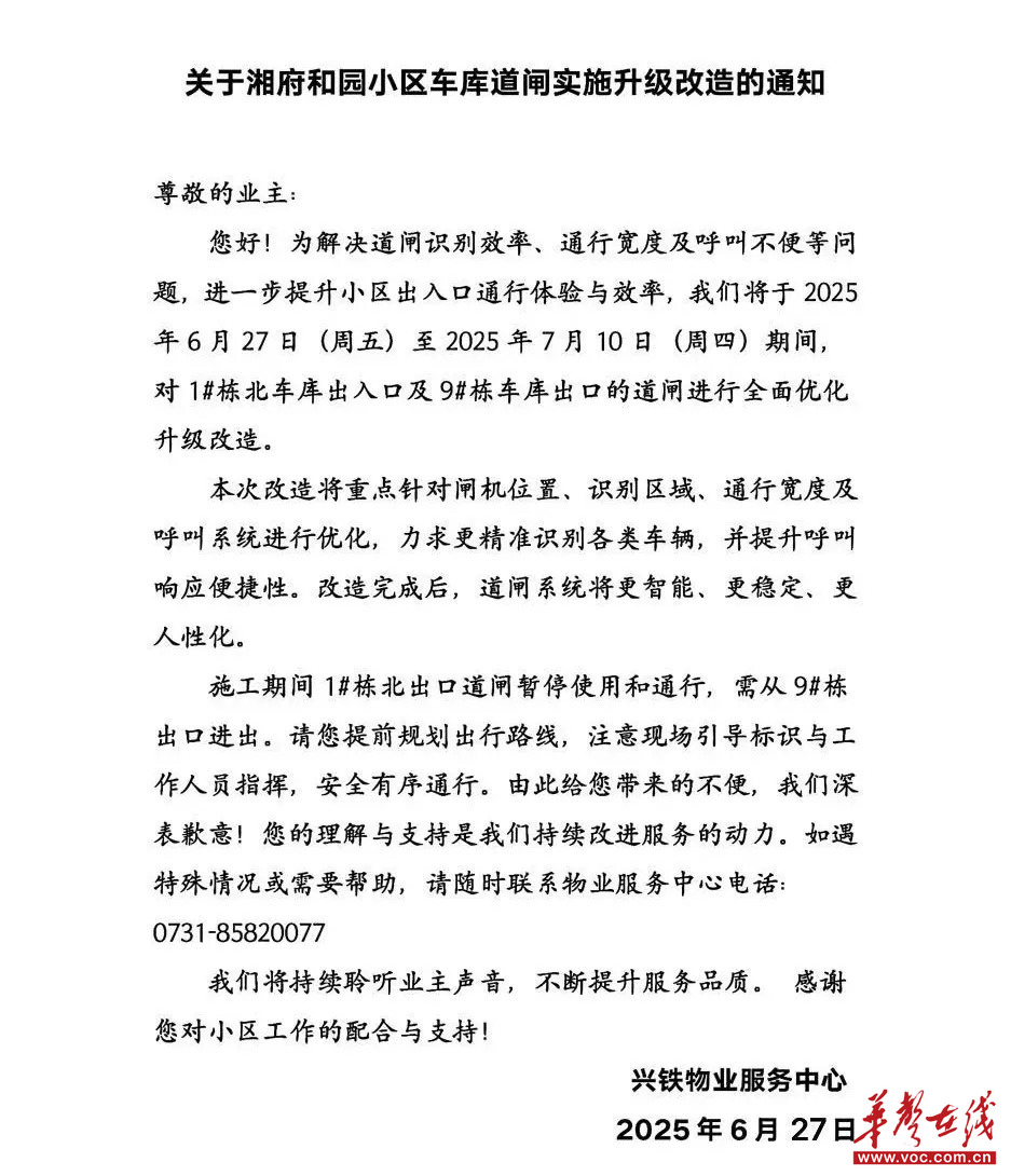 6月27日,湘府和園小區,興鐵物業服務中心發布了一則關于車庫道閘改造升級的通知,張貼在車庫和樓道出入口。“其文本文體得當、要素齊全、語言精準,可謂細節滿滿、面面俱到,如果是一般的工作態度,很難達到這樣的水平”,一名辦公室的“老筆桿子”偶然看見,給予了這樣的評價。
