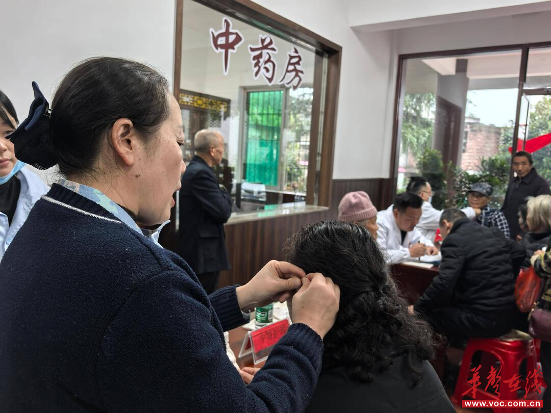揭牌儀式剛結束,早已等候多時的鄉親們便有序前往各義診區。來自縣中醫院的中醫護理專家耐心接待每一位群眾,先通過望聞問切明確體質與病癥,再精準定位耳穴,將貼有王不留行籽的膠布穩穩貼在對應穴位上,一邊操作一邊講解:“這是神門穴,能安神助眠;這是胃穴,針對消化不良,平時沒事可以按一按,酸脹感越明顯效果越好。”