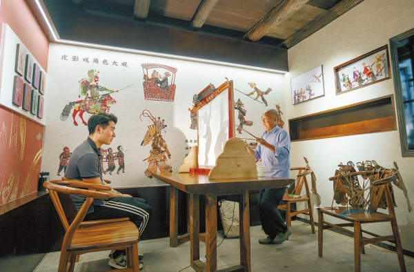皮影戲體驗區的白色幕布前,85歲的蘭錦標老人坐在凳子上,面前擺著琳瑯滿目的皮影。這些皮影都是他和同伴們純手工制作的,有些已伴隨他幾十年。只見老人嘴上唱著戲詞,手指輕輕一挑木桿,雙腳不時跺著地板打節拍,幕布上的角色立刻“舞”起來,引得眾人拍手叫好。“我從小學皮影,會唱兩百多出戲哩!”老人笑著說,從前他常在田間地頭、村口曬谷場搭個簡易戲臺就開演,如今在非遺展示館,他有了專屬舞臺,成了大家眼里的“明星”,“能把皮影戲唱給更多人聽,我心里高興!”