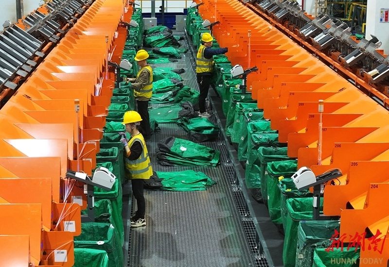 11月5日,中國郵政集團有限公司衡陽郵區中心局郵件處理中心,工作人員在分揀快遞包裹。臨近“雙11”,快遞處理量持續攀升,該中心啟動彈性排班機制,全力迎戰物流高峰,保障寄遞時效和服務質量。