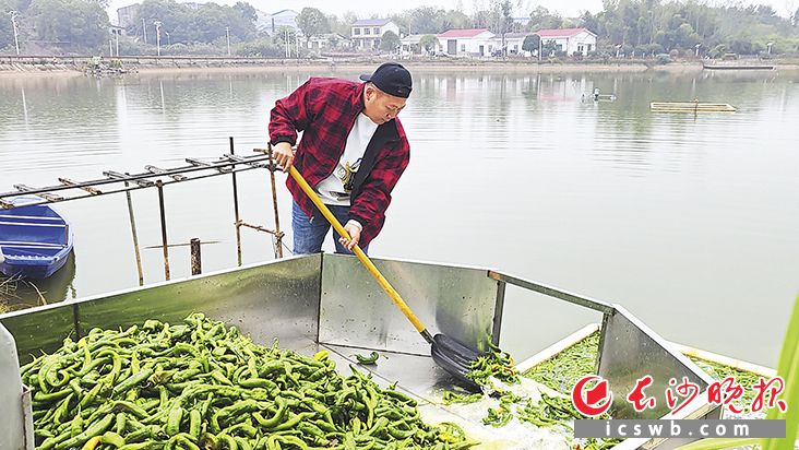 姜勝承包的魚塘平均每天要投喂兩千公斤辣椒。長沙晚報全媒體記者 李金 攝