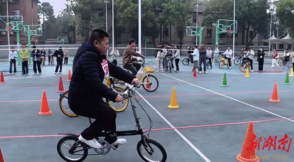教師們的積極參與也成為運動會的另一道風景。湖南農業大學專為教工組設置了自行車障礙賽,老師們靈活避開障礙、穩步前行,展現講臺外的運動風采;迎面接力賽中,老師們褪去講臺的嚴肅,在跑道上奮力奔跑,贏得學生們陣陣歡呼。