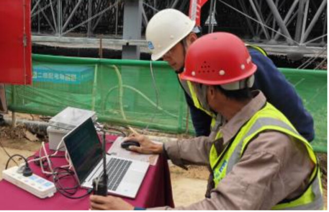 (現場工作人員操作屋蓋鋼結構提升。符碩 攝)