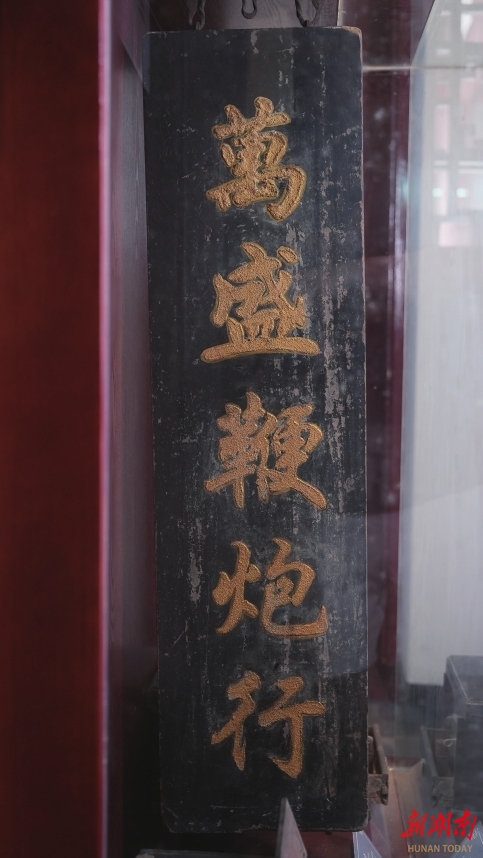 民國時期,瀏陽人在武漢漢口開設的“萬盛鞭炮行”鎏金招牌。