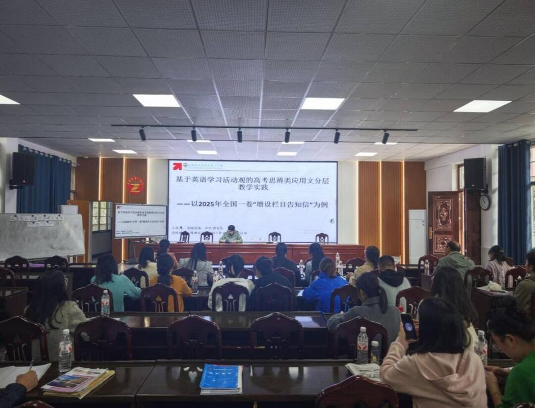 炎陵一中會場,曾先發老師以英語學習活動觀為核心,帶來《基于英語學習活動觀的高考思辨類應用文分層教學實踐》講座。她以 2025 年全國一卷 “增設欄目告知信” 真題(二選一推薦 “Fun at my school” 或 “Guess who I am”)為載體,設計分層教學。案例設計緊扣 “學習理解-應用實踐-遷移創新” 三階邏輯,讓分層教學不再是空談。