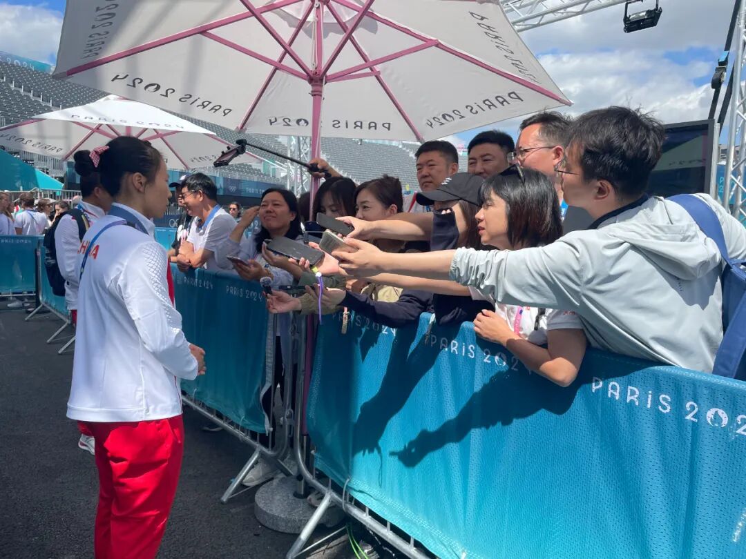 巴黎奧運會攀巖賽場,蔡矜宜(前排右二)在混采區采訪速度攀巖銀牌獲得者、湖南運動員鄧麗娟。但在此之前