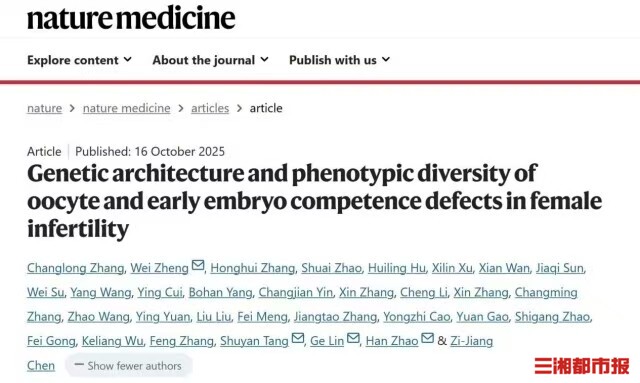 華聲在線11月9日訊(文/視頻 全媒體記者 高煜棋 通訊員 鄭偉 喬木)11月9日,記者從中信湘雅生殖與遺傳??漆t院了解到,該院院長林戈和鄭偉副研究員團隊與國內同行合作攻關,在全球頂尖醫學期刊《自然—醫學》(Nature Medicine)上發表了一項重要研究成果,該研究系統揭示了導致女性反復“試管”(IVF)失敗的卵子與早期胚胎質量問題的遺傳根源,并為其建立了一套清晰的分類與基因診斷體系。這意味著我國向實現“精準生殖醫學”的目標又邁出了關鍵一步,未來將為更多家庭的生育夢想保駕護航。