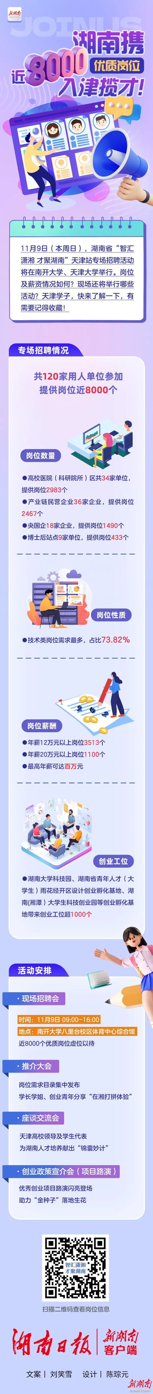 此次天津站專場招聘活動,湖南錨定“4×4”現代化產業體系需求與高校專業優勢的契合點,拿出了包括高校醫院(科研院所)、產業鏈民營企業、央國企和博士后站點等約8000個崗位,覆蓋工程機械、電子信息、生物醫藥、金融服務等多個重點領域。