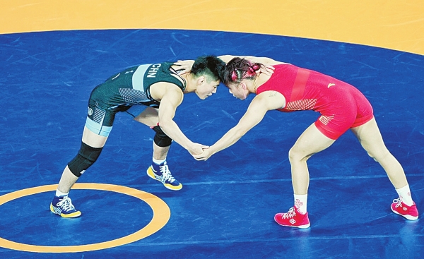11月10日,在清遠進行的第十五屆全運會摔跤女子53公斤級決賽中,湘潭妹子龐倩玉(左)收獲一枚銀牌。華聲在線全媒體記者 傅聰 攝