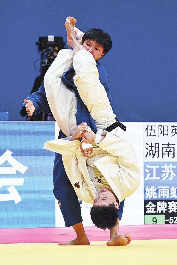 11月10日,湖南隊選手伍陽英(前)在柔道女子52公斤級比賽中獲得銀牌。新華社 發