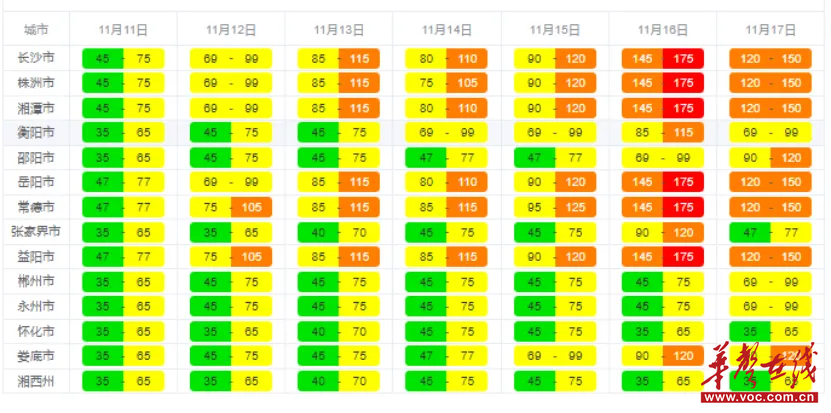 16至17日,受較強(qiáng)冷空氣南下影響,受污染傳輸影響,湘中、湘北空氣質(zhì)量有輕到中度污染風(fēng)險(xiǎn),湘西、湘南空氣質(zhì)量以?xún)?yōu)良為主。