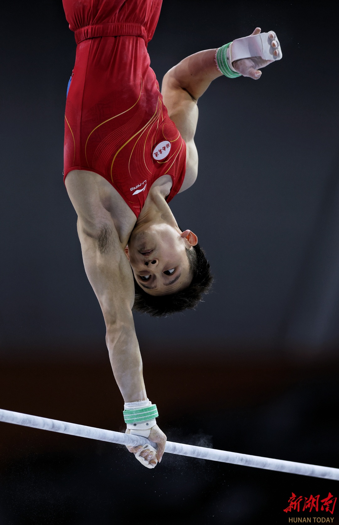 飄逸、流暢地完成所有杠上動作后,騰空、轉體、落地,14.600分!最后一個出場的張博恒,雖已無力回天,但他仍祭出一套堪稱完美的單杠表現,用實力證明了自己,也為團隊拼盡了最后一顆子彈。這之前,湖南隊仍落后排名第一的江蘇隊16.533分,金牌已經無望。